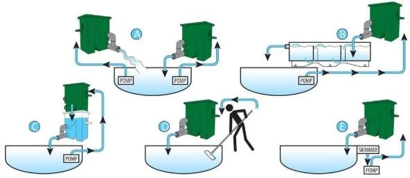 - Als voorfilter boven een pompgevoed (vortex/meerkamer)filter (B)