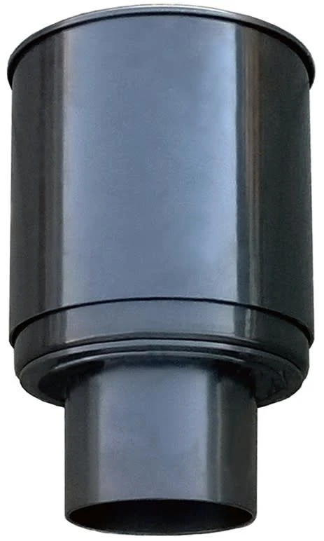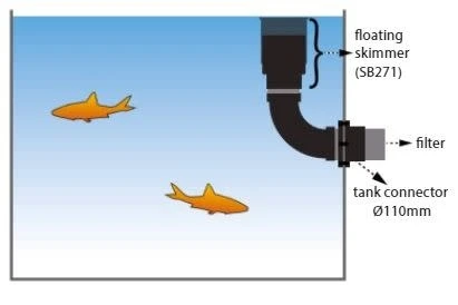 De drijvende skimmer met korf dient vastgezet te worden aan 110mm buis door middel van een flexibele koppeling of manchet mof. De uitgang met een diameter 110mm mof zit aan de onderzijde van de drijvende skimmer. De skimmer blijft drijven door middel van lucht en ontsnappingsgaten in de drijvende kap.