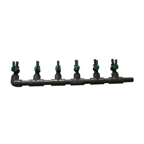 Aquaking lucht verdeelset met 6 aansluitingen. Aansluiting vanaf luchtpomp 20 mm, uitgangen 9 mm. Is traploos regelbaar.