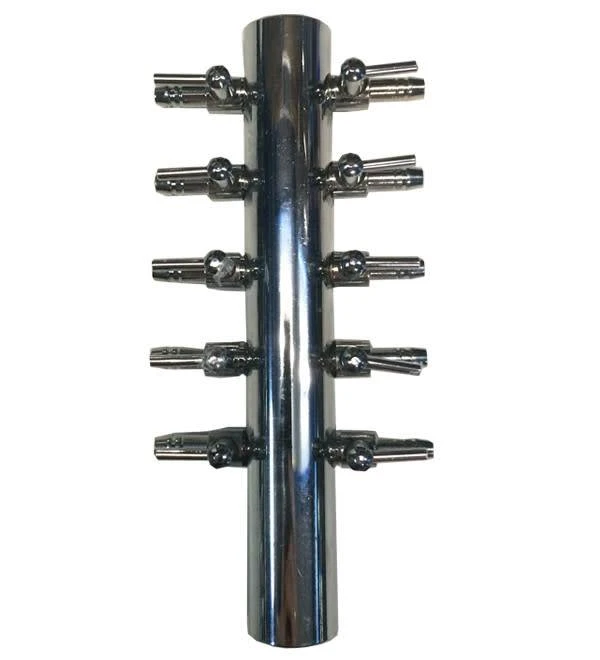 Luchtverdeler voor 4mm 10 uitgangen met kraan messing. Aansluiting vanaf luchtpomp 18 mm.