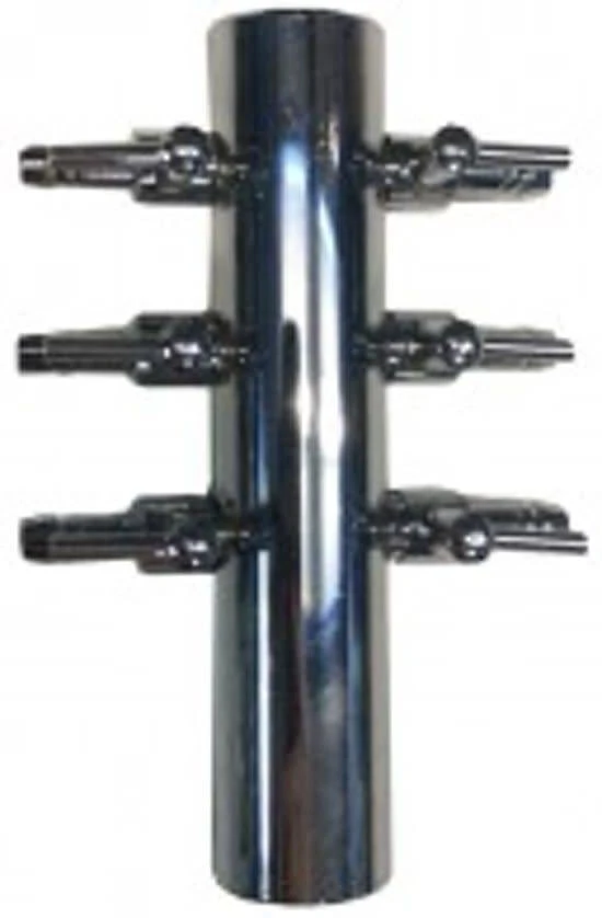 Luchtverdeler voor 4mm 6 uitgangen met kraan messing. Aansluiting vanaf luchtpomp 18 mm.