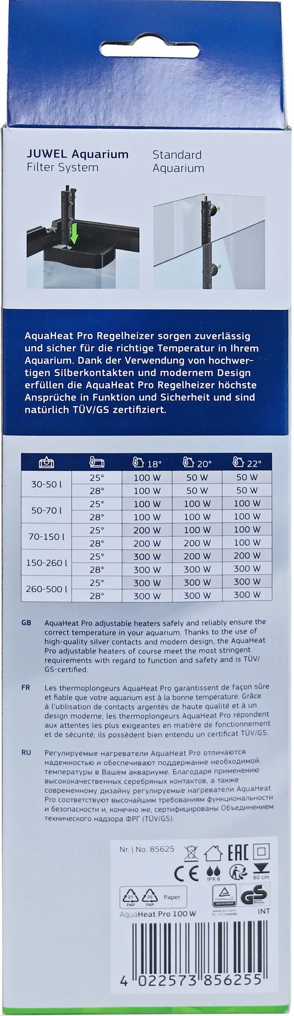 De Juwel verwarmer Aqua Heat pro zorgt op een betrouwbare en veilige manier voor de juiste temperatuur in uw aquarium. Afhankelijk van de ruimtetemperatuur en de aquariumgrootte bereikt u met de Juwel verwarmer een watertemperatuur van ca. +28 graden C.