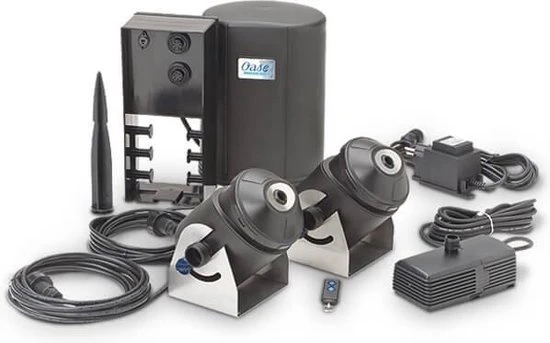 De Water Jet Lightning fontein wordt geleverd met een radiografische afstandsbediening met een bereik van 80 meter (mits het oppervlak vrij is) Water Jet in een set van 2 en een trafo met kabel. De straalhoek is individueel instelbaar van de Water Jet’s en de hoogwaardige RVS voet kan op verschillende ondergronden worden geplaatst. Eventueel ook op een tijdklok aan te sluiten. Vooral bij schemering krijg je hele mooie lichteffecten te zien van de neutraal witte kleuren van de LED-verlichting. Eigenschappen Water Jet Lightning fontein Oase * paraboolhoogte max.: 090 m. * paraboolwijdte max.: 180 m. * waterstraal diameter: 8 mm * lichtkleur: RGB * afmetingen fonteinen: 150 x 115 x 200 mm * afmetingen 12 V. regelbox: 215 x 180 x 305 mm * inclusief grondpen * afmetingen voedingseenheid: 160 x 100 x 100 mm * spanning: 230V/ 50Hz/12V/AC * vermogensopname: 41 Watt * nettogewicht fontein: 1054 kg * lengte van de stroomkabel: 25 meter (voeding) + 8 meter (12 V) * garantie: 2 jaar + 1 jaar aanvraaggarantie Let op: om de vorm van de waterbogen te behouden dienen ze op een plaats gemonteerd te worden die tegen de wind is beschermd. Ook de waterkwaliteit is van invloed op de waterbogen.