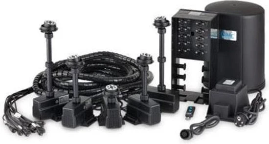 De Water Quintet Creative fontein wordt geleverd met een radiografische afstandsbediening met een bereik van 80 meter (mits het oppervlak vrij is) 5 pompen met sproeikoppen en een trafo met kabel. De variërende fonteinhoogte’s en de lichtintensiteit worden in vaste programma’s weergegeven. Eventueel ook aan te sluiten op een tijdklok. Vooral bij schemering krijg je hele mooie lichteffecten te zien van de neutraal witte kleuren van de LED-verlichting. Eigenschappen Water Quintet Creative fontein Oase * fonteinhoogte: 030 – 140 m. * waterstraal diameter: 5 mm * afmetingen fonteinen: 110 x 80 x 125 mm * afmetingen 12 V. regelbox: 215 x 180 x 305 mm * afmetingen voedingseenheid: 160 x 100 x 100 mm * spanning: 230V/ 50Hz/12V/AC * vermogensopname: 50 Watt * nettogewicht fontein: 108 kg * lengte van de stroomkabel: 25 meter (voeding) + 8 meter (12 V) * garantie: 2 jaar + 1 jaar aanvraaggarantie