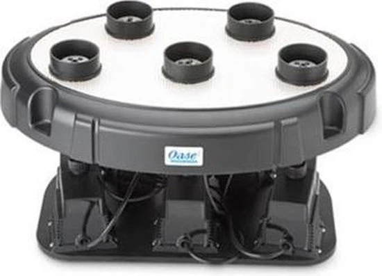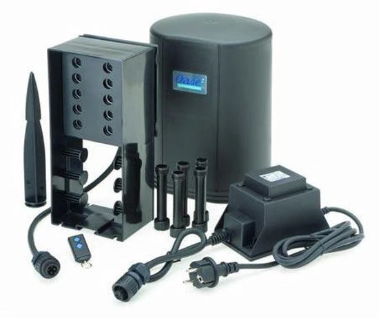 De Water Quintetfontein wordt geleverd met afstandsbediening met een bereik van 80 meter (mits het oppervlak vrij is) 5 pompen en sproeikoppen en een trafo met kabel. De variërende fonteinhoogte’s en de lichtintensiteit worden in vaste programma’s weergegeven. Eventueel ook aan te sluiten op een tijdklok. De stevige onderplaat biedt voldoende bescherming en is op verschillende ondergronden te plaatsen. De fontein is zelf ook nog instelbaar in de hoogte (20 cm). Vooral bij schemering krijg je hele mooie lichteffecten te zien van de neutraal witte kleuren van de LED-verlichting. Eigenschappen Water Quintet fontein Oase * fonteinhoogte: 030 – 140 m. * waterstraal diameter: 5 mm * afmetingen fontein: 430 x 300 x 240 mm * afmetingen 12 V. regelbox: 215 x 180 x 305 mm * afmetingen voedingseenheid: 160 x 100 x 100 mm * spanning: 230V/ 50Hz/12V/AC * vermogensopname: 50 Watt * nettogewicht fontein: 113 kg * lengte van de stroomkabel: 25 meter (voeding) + 8 meter (12 V) * garantie: 2 jaar + 1 jaar aanvraaggarantie