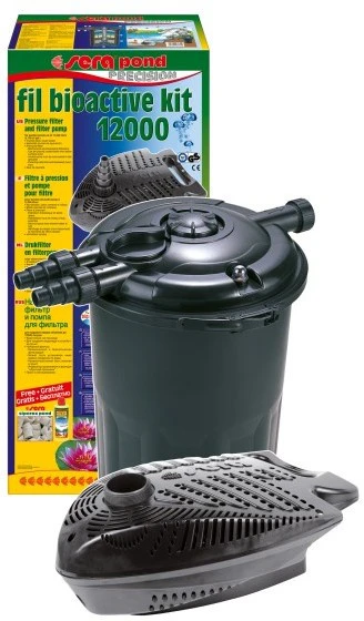 Sera Pond Fil Bioactive drukfilter Het direct mechanismebiologisch actieve sera pond fil bioactive drukfilter is geschikt voor alle vijvers tot 12.000 l en kan ook in watervalsystemen gebruikt worden.Het voordeel van deze drukfilter is dat deze gelijk gebruiksklaar is en onopvallend geplaatst kan worden.Bij gebruik van dit drukfilter bevelen wij het gebruik aan van Sera Pond UV-C systeem 55 Watt aan voor het op betrouwbare wijze elimineren van zweefalg, het reduceren van draad- en andere algen en het reduceren van ziekten!Standaard wordt dit drukfilter geleverd met 6 liter Sera Pond Siporax en 250 ml Sera Pond Filter Biostart en slangaansluitingen van 25, 32 en 40 mm (1, 1¼”” en 1½””)Tegen een kleine meerprijs zijn ook complete sets bij ons verkrijgbaar voor een snelle en eenvoudige start van een heldere vijver zoals:Sera Pond Fil Bioactive set 6000:Sera Pond fil bioactive drukfilter, 1 stukSera Pond PP 6000 vijverpomp van 65 Watt en pompcapaciteit van 5.600 liter per uur, 1 stukSera Pond slang, 5 mSera Pond Siporax, 6 literSera Pond filter biostart, 250 mlOFSera Pond Fil Bioactive set 12.000Sera Pond fil bioactive drukfilter, 1 stukSera Pond PP 12000 vijverpomp met verbruik van 165 Watt en pompcapaciteit van 12.000 liter per uur, 1 stukSera Pond slang, 5 mSera Siporax Pond, 6 literSera Pond filter biostart, 250 m