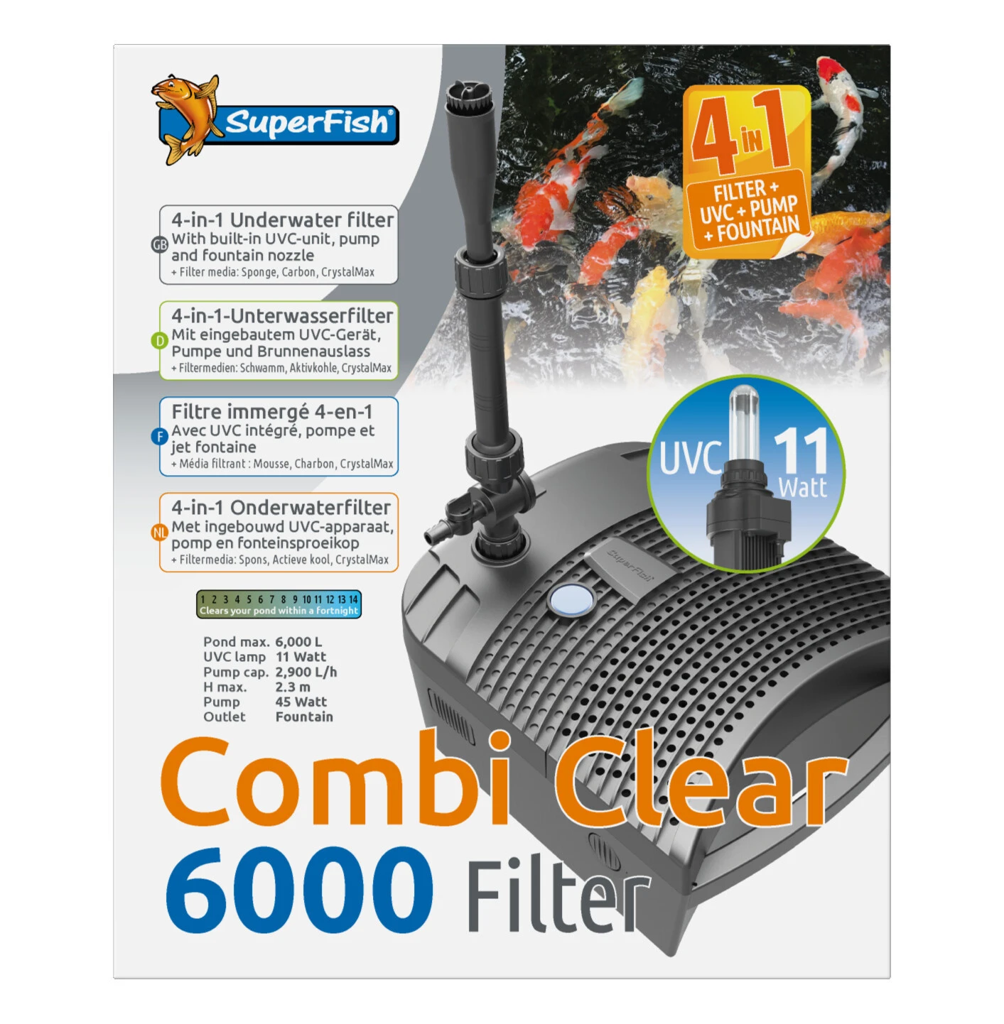 De Combi Clear 6000 Filter van Superfish is een 4-in-1 onderwaterfilter voor de kleinere vijver. Deze filter bevat, naast de filter, een ingebouwd UVC-apparaat, pomp en fonteinsproeikop. Het apparaat is energiezuinig en dus voordelig in gebruik.