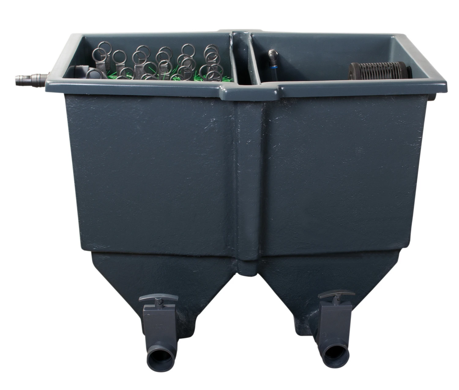 Extreem goede biologische werking door Floating Bed FiltratieFloating Bed Filtratie is ontwikkeld in de aquacultuur. Het bestaat uit in het water zwevende gekartelde kunststof ringen met een zeer hoog hechtingsoppervlak wat doormiddel van beluchting continu in beweging gehouden wordt. De beluchting komt van de bodem zodat het filtermedium steeds omgewoeld wordt.