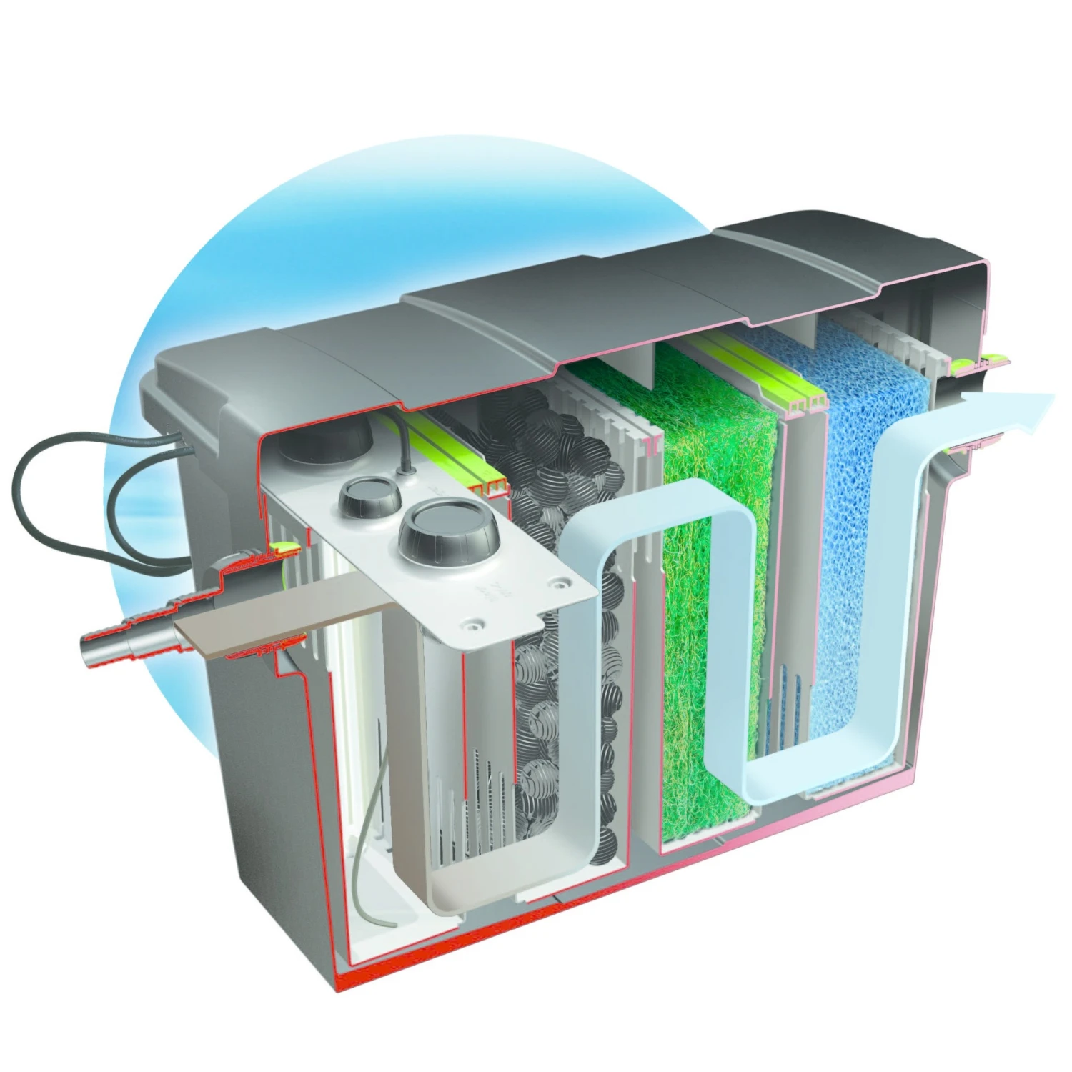 De basis van het Giant Biofill XL is een grote en ruime filterunit met een bruto inhoud van circa 210 liter. Om de filtercapaciteit extra te vergroten, kunnen meerdere filters aan elkaar worden gekoppeld met de bijgeleverde aansluitstukken. Midden onderin het filter is een afvoermogelijkheid gecreëerd. Door eenvoudig de schuif te openen wordt slib en vuil afgetapt.