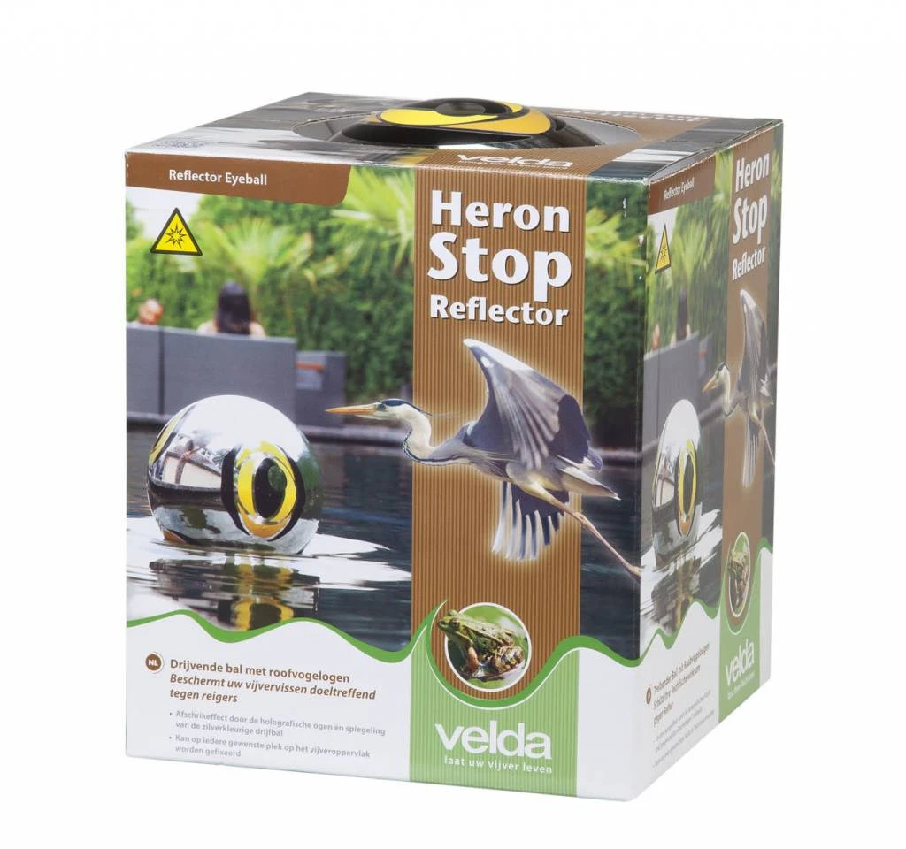 Tijdens raketlanceringen wordt hetzelfde principe gebruikt om vogels op een afstand te houden. Laat deze unieke Heron Stop Reflector in de vijver drijven om een directe vluchtreactie teweeg te brengen. De drijvende bal met de ogen van een roofvogel zal voorkomen dat reigers de vijver nogmaals zullen bezoeken en kostbare vissen tot het laatste exemplaar weg vangen.