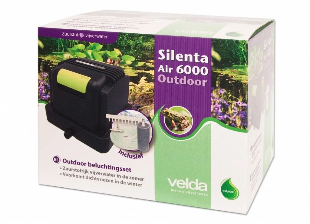 De Silenta Outdoor Pro luchtpomp is bestand tegen regenwater en staat naast de vijver. De luchtslang voert zuurstof naar de luchtsteen die in de vijver hangt. In de vorm van luchtbellen wordt de zuurstof afgegeven aan het vijverwater. Tegelijkertijd voeren de bellen schadelijke gassen af die zich in de diepere waterlagen bevinden. Zo voorkom je verstikking van het microleven en de vissen in de vijver. Al jarenlang vormt Silenta een sterke serie luchtpompen binnen het Velda assortiment. De nieuwe versie heeft een verbeterde motor en robuuste behuizing. Ze staan garant voor een zeer laag geluidsniveau en lange levensduur.